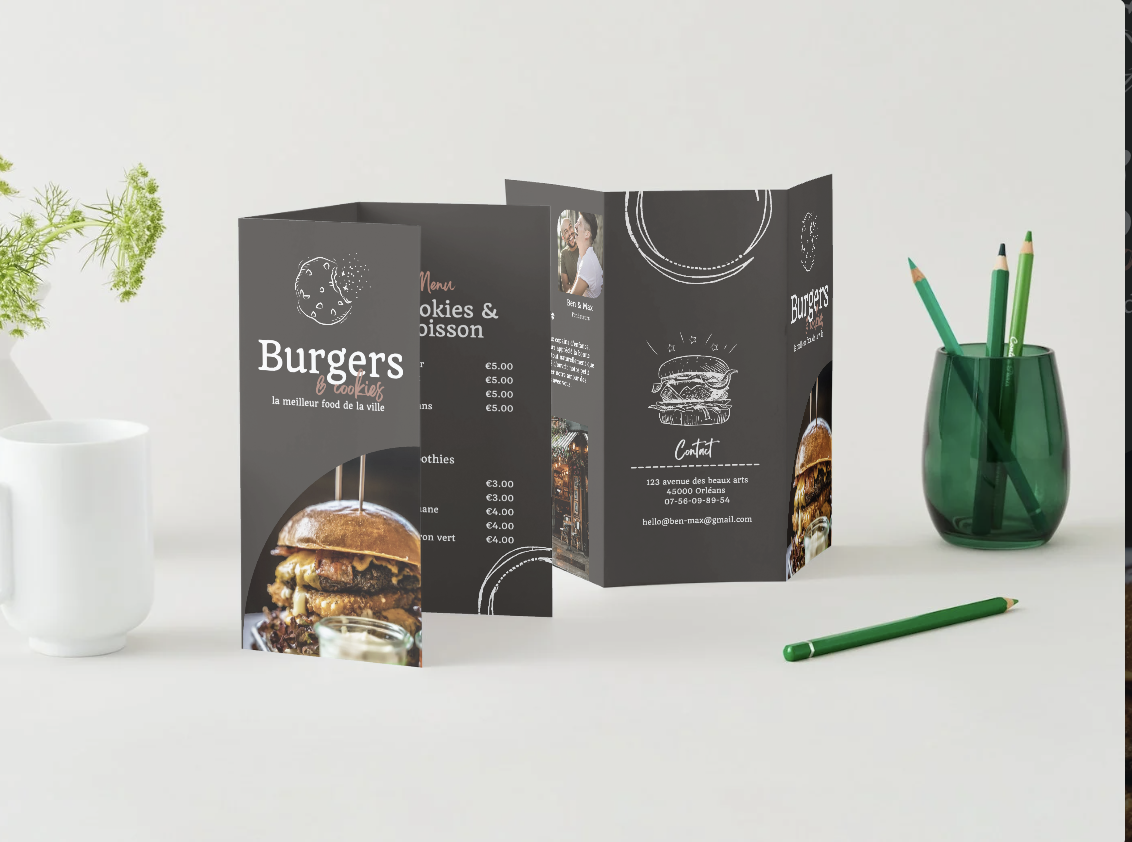 Une brochure en trois volets pour présenter la carte des burgers et cookies